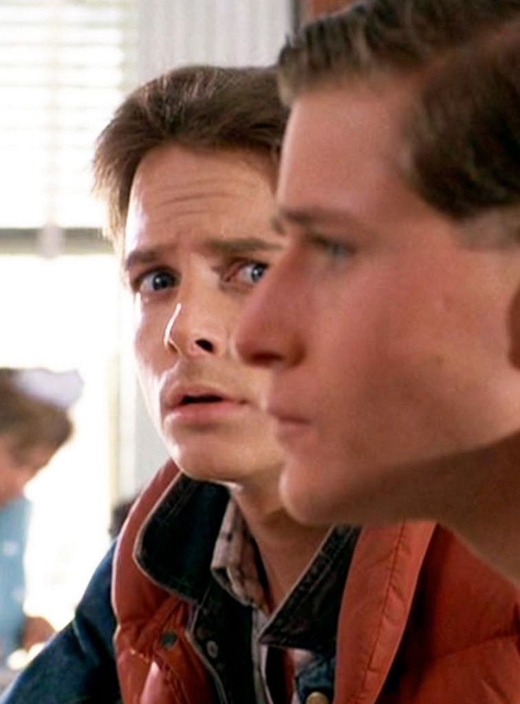 Marty McFly (Michael J. Fox) conoce a su padre George McFly (Crispin Glover) en 1955; escena de la película Back To The Future (1985); still photo.