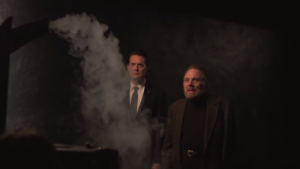 La estocada maestra a mi parecer fue que Lynch rescató a la incomprendida cinta de “Fire Walk with Me” de 1992, y la volvió el marco conceptual sobre la que gravita Twin Peaks: The Return. Originalmente, aquella película iba a ser la primera de tres esfuerzos que iban a darle una conclusión definitiva a la historia original; muy probablemente el director no se desvió de su plan inicial, presentándolo bajo nuevos términos para el siglo XXI. Las atmósferas sobrenaturales, los performances viscerales y de gran catarsis, y la tónica violenta y transgresora de Fire Walk with Me fueron una presencia evidente en The Return, atando a sus cabos sueltos y haciendo atinados callbacks a sus escenas cumbre—el grito de Laura Palmer en la oscuridad, líneas como “write it in your diary” y “we live inside a dream”, así como darle sentido a la locura de Phillip Jeffries (David Bowie) y ampliar la mitología detrás de la enigmática “tienda de conveniencia”—y así como también de reapropiarse de sus fantasmagóricas vistas y escenarios los cuales fueron obtusos en el ’92 pero que pudo darles un nuevo lustre tanto en The Return como en el box set revisionista de “The Entire Mystery” publicado en 2014. Me refiero a cosas como estas: