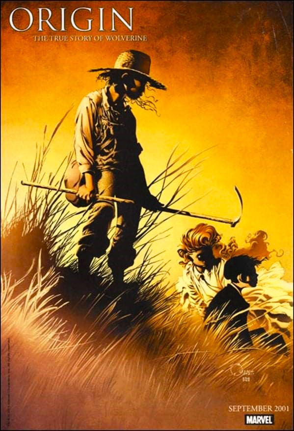 Poster promocional para el comic “Origin” (Marvel Comics, 2001); arte por Joe Quesada y color por Richard Isanove.