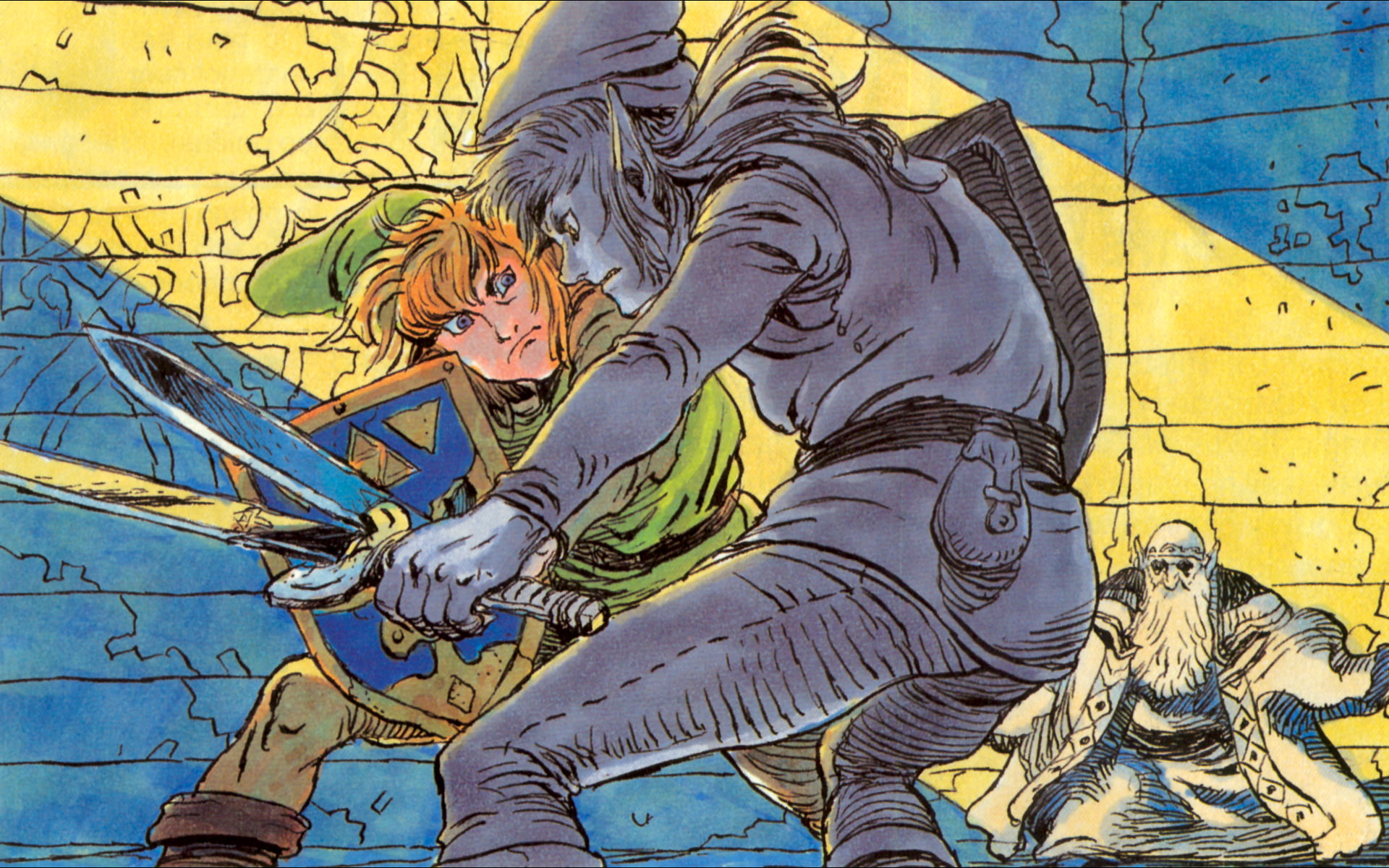 “Link versus Shadow Link, siendo observados por el Guardián de la Trifuerza”; arte promocional para el juego de video Zelda II: The Adventure of Link (Nintendo, 1987), y publicado originalmente en la guía de estrategia del juego The Legend of Zelda: A Link to the Past (Nintendo Player’s Guide, Nintendo/Tokuma Shoten Publishing Co., 1992). Arte por Katsuya Terada.