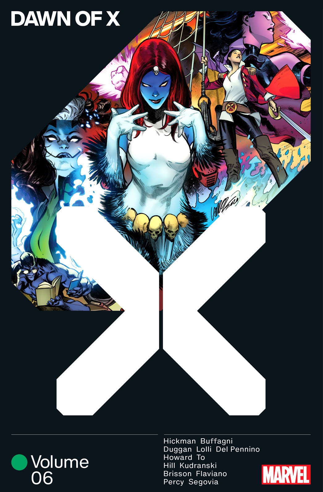 Portada para el tomo recopilatorio de Dawn of X vol. 6 (Marvel Comics, 2019-2020); arte por Pepe Larraz, color por David Curiel y diseño por Tom Muller.