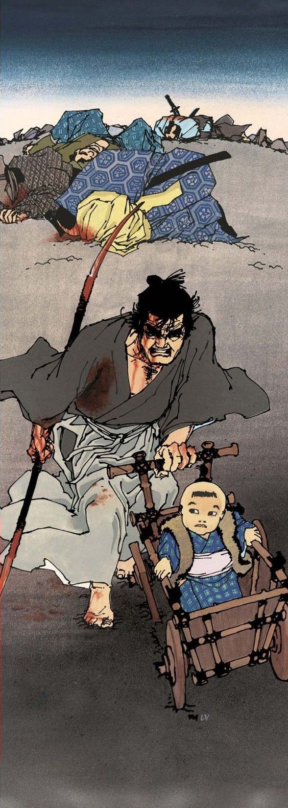Portada para Lone Wolf and Cub #7 (First Comics, 1987); arte por Frank Miller y color por Lynn Varley.